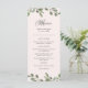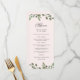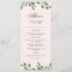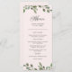 Cette carte de menu mariage branchée présente des bordures haut et bas de feuilles vert aquarelle abondants et quelques petits fruits sur un arrière - plan rose pâle et doux. La calligraphie moderne dit "Menu". Le choix idéal pour votre réception de mariage minimaliste et élégante.