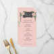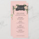 Ce menu de fleurs désertiques présente des fleurs roses et de la verdure de part et d'autre d'une boîte noire incurvée avec le mot "Mangeons". Il y a de la place pour 5 plats. Tous les détails du menu peuvent être modifiés. Les couleurs sont le vert, le rose, le blanc et le noir. Le nom de la mariée et du marié est affiché sur le dos.