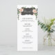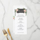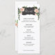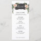 Ce menu de fleurs désertiques présente des fleurs roses et de la verdure de part et d'autre d'une boîte noire incurvée avec le mot "Mangeons". Il y a de la place pour 5 plats. Tous les détails du menu peuvent être modifiés. Les couleurs sont le vert, le rose, le blanc et le noir. Le nom de la mariée et du marié est affiché sur le dos.