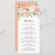 Ajoutez un accent floral élégant à votre paysage de table d'évènement avec cette carte de menu floral personnalisable. Il dispose d'une guirlande florale aquarelle de pêche, de roses orange et ivoire, de pivoines et d'hydrangées avec des accents d'eucalyptus et de verdure. Personnalisez cette carte de menu floral en ajoutant vos propres détails. Cette carte de menu aquarelle est parfaite pour les mariages printaniers, les douches nuptiales, les baby showers et bien plus encore.