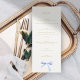 Cette carte à plat chic et tendance du menu mariage blanc offre un menu entièrement personnalisable ainsi qu'une jolie illustration couleur azur en ruban. Le verso comprend du texte facultatif, que vous pouvez modifier. Si aucun texte n'est préféré à l'arrière, laissez simplement cette zone de texte vide. Vous pouvez également ajouter vos initiales ou vos noms au verso seulement.