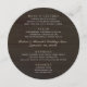 Menu mariage ronde à l'aspect bois foncé. Le titre est au centre avec quatre sections pour lister les entrées / hors-d’oeuvre, salade, entrées et dessert ou tout autre mets qui sera servi à la réception ou le dîner de répétition. Chaque section peut contenir jusqu'à quatre lignes de texte. Couleur brun foncé avec en-têtes tannés et script central qui peut contenir les noms du couple, le titre du menu et la date de l’événement. Les éléments de menu sont en majuscules et en blanc imprimé. Afficher comme forme ronde ou choisir carré. Mises à niveau du papier proposées.