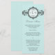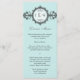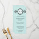 Carte de menu qui prend son influence de l'époque Art Déco. Un groupe orné, qui ressemble à une montre victorienne, présente un médaillon tenant le monogramme du couple. L'arrière - plan d'aqua pâle imprime un motif subtil comme filigrane. Ajoutez ou réduisez l'espace entre le premier et le dernier initiales pour équilibrer avec le monogramme central. Ajoutez un menu customisé en dessous. Un look classique qui donne l'ambiance à n'importe quel mariage. Disponible en couleurs alternatives avec des produits correspondants.