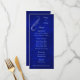 Cette jolie carte de menu formelle ou mariage présente une élégante image tourbillonnante en argent sur le côté supérieur gauche. Le texte de votre menu personnalisé est en argent et placé sur un arrière - plan bleu abstrait. Le dos de la carte est le même bleu royal. Cette carte correspond à "Silver Swirl Monogram Bright Blue Wedding Invitations" dans mon magasin, mais est appropriée pour toute occasion formelle en toute saison.