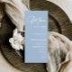 Parfait pour tout mariage bleu poussiéreux ou mariage bleu français. Ce menu époustouflant vient compléter un thème mariage bleu poussiéreux, idéal pour un mariage côtier ou tout mariage bleu clair. Améliorez votre thème mariage bleu avec ce menu mariage bleu clair, adapté aux mariages bleu bébé et ajoutant une touche de sophistication à une mariage bleue et blanche. Avec de beaux accents d'hydrangée bleue, c'est le "quelque chose de bleu" parfait pour votre journée spéciale, assurant une cohésion thème bleu clair mariage ou thème mariage bleu bébé.