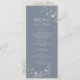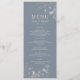 Vintage, boho, menu mariage bleu floral et poussiéreux avec élégance perwinkle et écriture simple et lettrée à la main.