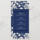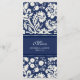 Elégant menu de dîner de mariage en bleu marine foncé et crème blanc classique motif damassé floral, personnalisable avec vos détails de dîner, disponible dans une large gamme de produits mariages assortis.
