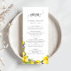Ce magnifique menu mariage est composé de citrons lumineux aux fleurs de lavande et d'un élégant script. Vous pouvez customiser le texte sur l'invitation à répondre à vos informations personnelles. Le dos est à l'ombre d'une aquarelle jaune.