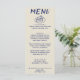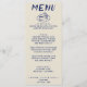Un menu de dîner mariage rétro coloré et moderne Periwinkle. Ce qui présente un design modèle chic de boho vintage beige arrière - plan et marine stylo de typographie bleue et menu écrit à la main en bleu avec pièce dessinée à la main. Parfait et assorti à toute la suite.