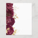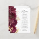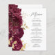 Le bord gauche de cet élégant menu mariage moderne présente un agencement floral bordeaux orné d'un feuillage en feuille d'or. Le texte personnalisable combine le script d'écriture manuscrite gris charbon et les polices sans serif sur un arrière - plan blanc. Le design floral bordeaux et or est répété à l'envers.