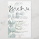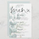 Menu Mariage moderne Eucalyptus Script. Un prix économique de 5,5" x 8,5", sur un élégant stock LINEN de 110 lb - pour une sensation de luxe à un bon rapport qualité-prix, il est parfait pour les menus, ainsi que des invitations et des programmes, etc. Cette alternative de taille budgétaire est également disponible dans d'autres choix de papier. Le stock de carte SEMI-GLOSS 110 lb est à peu près de la même épaisseur qu'une carte postale, donc fonctionne bien aussi pour les invitations. Le papier FELT 100 lbs est de couleur bouffante, PAS blanc, donc ajoute une touche rustique. Le stock de papier MATTE 80lbs est blanc vif, pour une impression nette, idéal pour vos menus et programmes, tandis que le papier SATIN 80lbs est mince et léger, idéal pour les enceintes. VEUILLEZ NOTER QUE LES ENVELOPPES OPTIONNELLES SONT UN PEU PLUS GRANDES EN TAILLE À 6,75" x 9" env. Ce design moderne a Menu dans élégant script défini en haut et le reste du texte centré en dessous duquel vous pouvez facilement personnaliser, avec un arrière - plan teinté d'eucalyptus bleu.