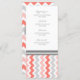Elégant menu de dîner de mariage dans élégant motif rétro zigzags de chevrons rose orange pêche, gris et blanc, personnalisable avec vos détails de dîner, disponible dans une large gamme de produits mariages assortis.