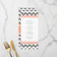 Elégant menu de dîner de mariage dans élégant motif rétro zigzags de pêche rose, gris et blanc chevron, personnalisable avec vos détails de dîner, disponible dans une large gamme de produits mariages assortis.