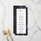 Cet élégant menu mariage moderne comprend un arrière - plan d'agate bleu marine couleur aquarelle orné d'une fausse parties scintillant dorée. Le texte s'affiche dans une élégante écriture manuscrite gris charbon et des polices de cuivre sur un rectangle blanc. La conception de l'agate est répétée à l'envers.