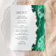 Le bord droit de cet élégant menu mariage moderne comprend une bordure d'aquarelle vert de mer ornée d'une parties scintillant en faux argent. Le texte personnalisable combine des polices de serif romaine gris fusain et des polices de cuivre sur un arrière - plan blanc. L'envers présente un design d'agate de mer et d'argent assorti.