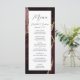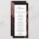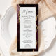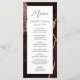 Cet élégant menu mariage moderne comprend un arrière - plan d'agate rouge bordeaux à l'aquarelle orné d'une fausse parties scintillant dorée. Le texte apparaît dans une écriture élégante gris fusain et des polices sans serif sur un rectangle blanc. La conception de l'agate est répétée à l'envers.