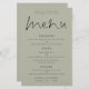 Élégant Script Soft Sage Green Mariage Menu. Un prix économique de 5,5" x 8,5", sur un élégant stock LINEN de 110 lb - pour une sensation de luxe à un bon rapport qualité-prix, il est parfait pour les menus, ainsi que des invitations et des programmes, etc. Cette alternative de taille budgétaire est également disponible dans d'autres choix de papier. Le stock de carte SEMI-GLOSS 110 lb est à peu près de la même épaisseur qu'une carte postale, donc fonctionne bien aussi pour les invitations. Le papier FELT 100 lbs est de couleur bouffante, PAS blanc, donc ajoute une touche rustique. Le stock de papier MATTE 80lbs est blanc vif, pour une impression nette, idéal pour vos menus et programmes, tandis que le papier SATIN 80lbs est mince et léger, idéal pour les enceintes. VEUILLEZ NOTER QUE LES ENVELOPPES OPTIONNELLES SONT UN PEU PLUS GRANDES EN TAILLE À 6,75" x 9" env. Un design typographique élégant avec un script de style d'écriture pour le Menu d'en-tête. Personnalisez facilement le reste du texte à vos propres détails, ce qui inclut de l'espace pour vos options végétaliennes ou végétariennes. Vous pouvez également modifier les styles et les couleurs de texte ainsi que les couleurs arrière - plans via l'option customiser plus si vous le souhaitez.