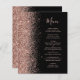 Le bord gauche de cet élégant menu mariage moderne présente une bordure rose en faux parties scintillant or. Le texte personnalisable combine un script d'écriture manuscrite rose rose et des polices de caractères sur cuivre sur un arrière - plan noir. L'envers présente une parties scintillant en or noir et rose assortie.