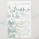 Eucalyptus Budget Elegant Script Mariage Menu. Un prix économique de 5,5" x 8,5", sur un élégant stock LINEN de 110 lb - pour une sensation de luxe à un bon rapport qualité-prix, il est parfait pour les menus, ainsi que des invitations et des programmes, etc. Cette alternative de taille budgétaire est également disponible dans d'autres choix de papier. Le stock de carte SEMI-GLOSS 110 lb est à peu près de la même épaisseur qu'une carte postale, donc fonctionne bien aussi pour les invitations. Le papier FELT 100 lbs est de couleur bouffante, PAS blanc, donc ajoute une touche rustique. Le stock de papier MATTE 80lbs est blanc vif, pour une impression nette, idéal pour vos menus et programmes, tandis que le papier SATIN 80lbs est mince et léger, idéal pour les enceintes. VEUILLEZ NOTER QUE LES ENVELOPPES OPTIONNELLES SONT UN PEU PLUS GRANDES EN TAILLE À 6,75" x 9" env. Ce design moderne a Menu dans élégant script défini en haut et le reste du texte aligné à droite en dessous duquel vous pouvez facilement personnaliser, avec un arrière - plan teinté d'eucalyptus bleu.