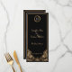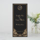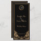 Ce magnifique et élégant menu de réception de mariage noir et or a un thème "Great Gatsby" des années 1920 inspiré par la résurgence de la culture populaire de l'esthétique design liée à l'époque Art Déco des années 1920. Un motif complexe et complexe crée un cadre géométrique dans les tons beiges ombragés qui se combinent pour donner un effet doré. Les initiales ou monogrammes de la mariée et de la mariée sont mis en évidence dans une couleur de police gris argenté contrastée.