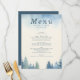 Un paysage forestier bleu et vert serein le long du fond, jumelé avec un script bleu classique et des polices serif pour un look raffiné. Parfait pour les mariages rustiques, en plein air ou de nature, cette carte de menu affiche vos cours et détails personnalisés dans un agencement clair et élégant. La douce arrière - plan pastel et la frontière romantique d'un pin ajoutent une touche de tranquillité à chaque cadre, créant une expérience culinaire inoubliable pour vos invités