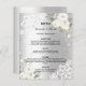 Un arrière - plan faux argenté décoré de fleurs blanches, de roses, de diamants et de dentelle blanche. Personnalisez et ajoutez vos noms et le menu. 1 feuille = 1 menu imprimé bord à bord.