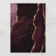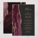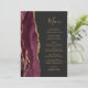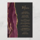 Le bord gauche de cet élégant menu mariage moderne comporte une bordure d'aquarelle rouge bordeaux ornée d'une parties scintillant en faux or. Le texte personnalisable combine un script d'écriture fantaisiste couleur or et des polices de cuivre sur un arrière - plan noir en ardoise. L'envers est assorti d'un design d'agate bordeaux et or.
