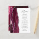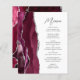 Le bord gauche de cet élégant menu mariage moderne présente une aquarelle bordeaux ornée d'une parties scintillant en faux argent. Le texte personnalisable combine le script d'écriture manuscrite gris charbon et les polices sans serif sur un arrière - plan blanc. Le design d'agate bordeaux et argenté est répété à l'envers.