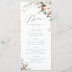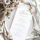 Conception de fleurs aquarelles élégantes de roses blanches, de pommes de pin, de baies et de verdure d'eucalyptus, avec un script moderne et stylé. Palettes festives de rouge, de vert sauge et de blanc, Menus personnalisés pour un mariage de Noël de vacances, un mariage de jardin campagnard et un mariage de Noël floral boho en hiver.
