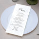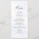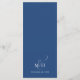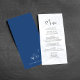 Ce design comprend une carte de menu mariage, avec un élégant script de calligraphie, avec un design floral bleu classique, avec un cours de repas simple, et un monogramme d'ampersand sur le dos.