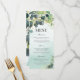 Elégantes cartes de menu de mariage avec une aquarelle ajourée rustique lavée d'arrière - plan, feuilles d'eucalyptus botaniques, éclaboussures de fausse feuille d'or, et une simple option de menu modèle.