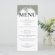 Magnifique menu mariage moderne dans le vert sauge et blanc avec feuilles eucalyptus (avant et arrière). Facile à mettre à jour - un côté contient vos options alimentaires, l'autre contient un message personnel et vos noms. Un design absolument agréable avec des anneaux mariages montrant sur le design avec vos noms.