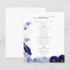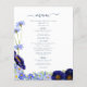 Magnifique artiste peint à la main fleurs sauvages et feuillage en bleu roux, bleu cornflower, bleu marine, violet et vert, idéal pour une journée unique de printemps ou d'été du menu mariage. Élégant script de typographie moderne en bleu marine complète la charmante boho à la main peinte à la main qui comprend des fleurs de maïs, pavot, cosmos, ne m'oubliez pas les noeuds et feuillage délicat. Menu mariage bohème chic parfait pour une prairie de printemps, mariage d'été dans le jardin. OEuvre originale de l'artiste Catherine Sweetman