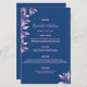 Une carte à la mariage à la fois élégante et tendance. Personnalisez et ajoutez vos noms, votre date et le menu mariage. Arrière - plan bleu décoré de sprigs botaniques roses et de feuillage. Vos noms sont écrits avec un script de style moderne écrit à la main. Retour : arrière - plan bleu.