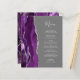 Le bord gauche de cet élégant menu mariage moderne comporte une bordure d'aquarelle violette ornée d'une parties scintillant en faux argent. Le texte personnalisable combine écriture manuscrite gris argent et polices de cuivre sur un arrière - plan gris moyen. L'envers est assorti d'un design d'agate violet et argenté.