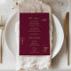 Menu mariage illustré bourguignon et chartreuse avec typographie d'inspiration vintage et illustrations dessinées à la main de figues, porte-bougie et cherub tenant un verre de vin.