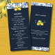 Étendez votre journée spéciale avec cette carte de menu Mariage italienne élégante et personnalisée, conçue pour compléter votre célébration méditerranéenne. Doté d'une bordure classique en tuiles italiennes bleues et blanches, cette carte de menu est ornée de citrons jaunes vibrants, symbolisant la joie et la prospérité. La police blanche immaculée se démarque magnifiquement d'un arrière - plan bleu marine chic, créant un look intemporel et sophistiqué. Parfait pour un mariage méditerranéen, cette carte carte ajoute une touche italienne au charme de votre table. Au fond, les hôtes trouveront un joyeux "That's Amore" accompagné d'un message de remerciement sincère du couple heureux, ce qui en fait un souvenir précieux de votre journée inoubliable.
