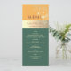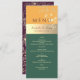 Simple, calligraphie, moderne, élégant, tons bijoux, menu mariage vert émeraude, jaune et prune violet avec dentelle dorée dorée fleurie.