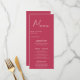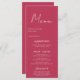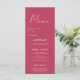 Cette carte à la carte mariage allie un design moderne et une calligraphie élégante. L'arrière - plan viva magenta, audacieux, est la toile de fond parfaite pour le texte magnifiquement scénarisé, créant un look sophistiqué et élégant. La conception est simple et polyvalente, ce qui permet une coordination aisée avec une variété de thèmes et de couleurs mariages. Et si vous préférez une couleur différente, le design est entièrement personnalisable pour correspondre à votre goût et vision unique. Faites de votre dîner mariage une expérience inoubliable grâce à cette carte à la carte étonnante et polyvalente.