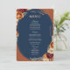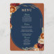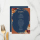 Menu moderne moderne et élégant à mariage floraux orange marine d'automne. Faites l'éloge de votre réception de mariage avec ce menu mariage moderne et élégant, qui allie un mélange sophistiqué de fleurs chaudes orange et de fleurs marines profondes. Parfait pour une élégante fête d'automne, cette carte de menu affiche magnifiquement vos détails de repas soigneusement traités tout en ajoutant une touche de charme saisonnier à votre paysage de table. Un ajout chic et intemporel à votre décor mariage !