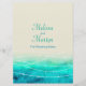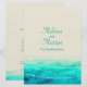 Belle mer bleu vert peint avec vagues graphiques scintillant sur la couverture mariage menu du dîner. Une belle plage, une carte mariage contemporaine inspirée de l'océan côtier, avec une mer d'aquarelle stylisée et main unique, sur un papier couleur sable. Idéal pour un mariage moderne à la plage. Modifiez ce menu avec vos propres mots. Unique conçu et peint par Sarah Trett.