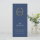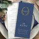 Menu mariage bleu marine foncé, blanc et doré. Modifiez ce menu de 4 plats avec votre propre libellé d'option de repas. Feuilles ovales et monogrammes modernes mais classiques dessinés à la main. © Dessin à main ovale original par Sarah Trett pour www.mylittleedenweddings.com exclusivement sur zazzle.
