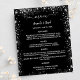 Un menu mariage élégant et glamour. Un arrière - plan noir, décoré de faux parties scintillant argentées, brille. Texte blanc. Personnalisez et ajoutez votre nom, vos dates et le menu. Vous pouvez ajouter du texte, des photos à l'arrière. 1 feuille = 1 menu imprimé bord à bord.