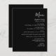 Ce menu mariage moderne simple est composé de texte blanc sur un arrière - plan noir. Le mot "Menu" apparaît en calligraphie manuscrite stylisée. Ajoutez le nom du couple et la date du mariage dans le script et l'italique, ainsi que les détails du menu dans la police sans serif. L'envers est noir solide.