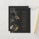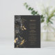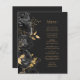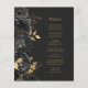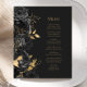 Cet élégant menu mariage moderne comporte une bordure de fleurs noires et de feuilles de fausse feuille d'or. Customisez le texte italique de couleur or sur un arrière - plan noir en ardoise foncée. L'arrière du menu est en ardoise noire.
