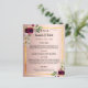 Un élégant menu mariage de style bohème et un programme en soirée. Plumes et roses luxuriants en bordeaux. Modèles pour vos noms, date, menu mariage et programme. Un cadre en faux or et un arrière - plan chic rose en dégradé d'or.