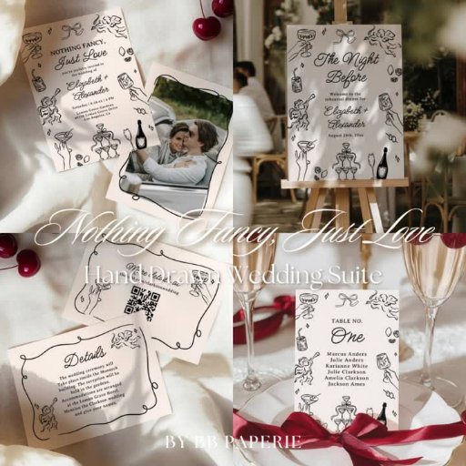 Cet ensemble de papeterie mariage ludique et romantique apporte un charme léger à votre grand jour. Le thème "Nothing Fancy, Just Love - Quirky & Whimsical" présente des illustrations dessinées à la main de lunettes clinking, figurines de danse, et toasts de champagne — le tout dans un art de ligne amusant, de style croquis. Avec son élégance décontractée et une touche d'humour, ce papier capture bien l'atmosphère des couples qui veulent quelque chose de décontracté, plein de personnalité, et totalement. Parfait pour les célébrations modernes qui sont plus liées à l'amour qu'à la tradition.