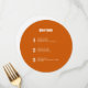 Ce menu mariage contemporain présente les plats de votre repas mariage en polices simples et un design épuré et élégant. Cette carte de menu orange brûlée se démarque certainement de la foule. La typographie moderne et le design de menu pour un mariage moderne. Tous les éléments sont personnalisables - texte, arrière - plan et couleurs. Modifiez les noms et les dates au verso - ou supprimez simplement si vous voulez utiliser cette carte de menu ronde pour un événement qui n'est pas un mariage.
