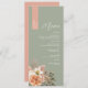 Ajoutez un charme rustique à votre réception grâce à ce menu personnalisé de sauge verte mariage avec le nom de chaque client dans une bande verticale d'accent pêche. Des polices de caractères élégantes et un arrière - plan vert apaisant se combinent magnifiquement avec les floraux romantiques de rougeur, de pêche et d'ivoire au fond, complétés par du feuillage séché pour une subtile touche de chute. Idéal pour les mariages boho, rustique ou campagnard, ce menu sert aussi de carte de séjour et de garde. Customisez facilement les cours de nom d'invité et de dîner pour votre journée spéciale.