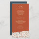 Un détail en pierre de terrazzo tendance et une typographie d'inspiration du milieu du siècle donnent à ce menu mariage une ambiance sans chichi, hip dans une palette de couleurs inspirées du désert de rouille, de rouille et de bleu ardoise, le tout complété par un monogramme moderne.